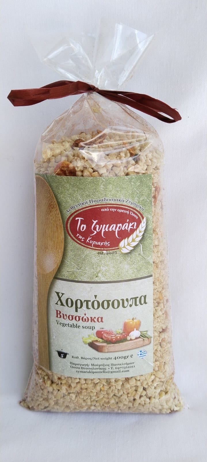 Συστατικά: αλεύρι ΣΙΤΟΥ, ΣΙΜΙΓΔΑΛΙ, νερό, μαϊντανός, κρεμμύδι, ντομάτα λιαστή, μπούκοβο γλυκό, πιπέρι μαύρο, σκόρδο σκόνη, κόκκινο πιπέρι γλυκό, καπνιστή πάπρικα. Τα λαχανικά είναι αποξηραμένα. Περιέχει γλουτένη. Διατροφική επισ. ανα 100 gr. ενέργεια/energy: 1381/330 kcal/kJ, συνολικά λιπαρά/total fat: 2 g, εκ των οποίων κορεσμένα/of which saturates: 0.5 g, υδατάνθρακες/carbohydrate: 70 g, εκ των οποίων σάκχαρα/of which sugar: 3 g, εδωδιμές ίνες/dietary fibres: 1, πρωτεΐνες/protein: 13 g, αλάτι/salt: 0.02 g Δοσολογία για 1 μερίδα: 3-4 κουταλίες της σούπας μίγμα με μία κούπα νερό. Χρόνος βρασμού 5 λεπτά. Ανακινήστε καλά πριν τη χρήση.
